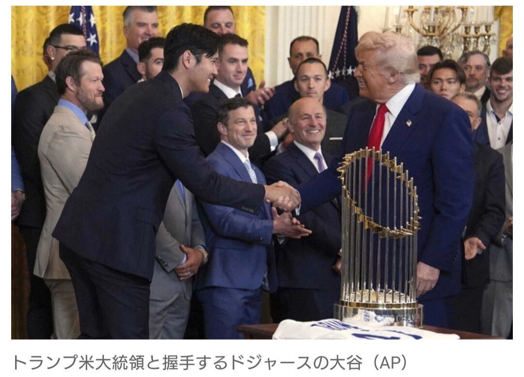 大谷翔平投手(30)らドジャースの選手たちが7日(日本時間8日未明)、ホワイトハウスでドナルド・トランプ米大統領(78)を表敬訪問。昨季、ワールドシリーズ制覇を報告した。